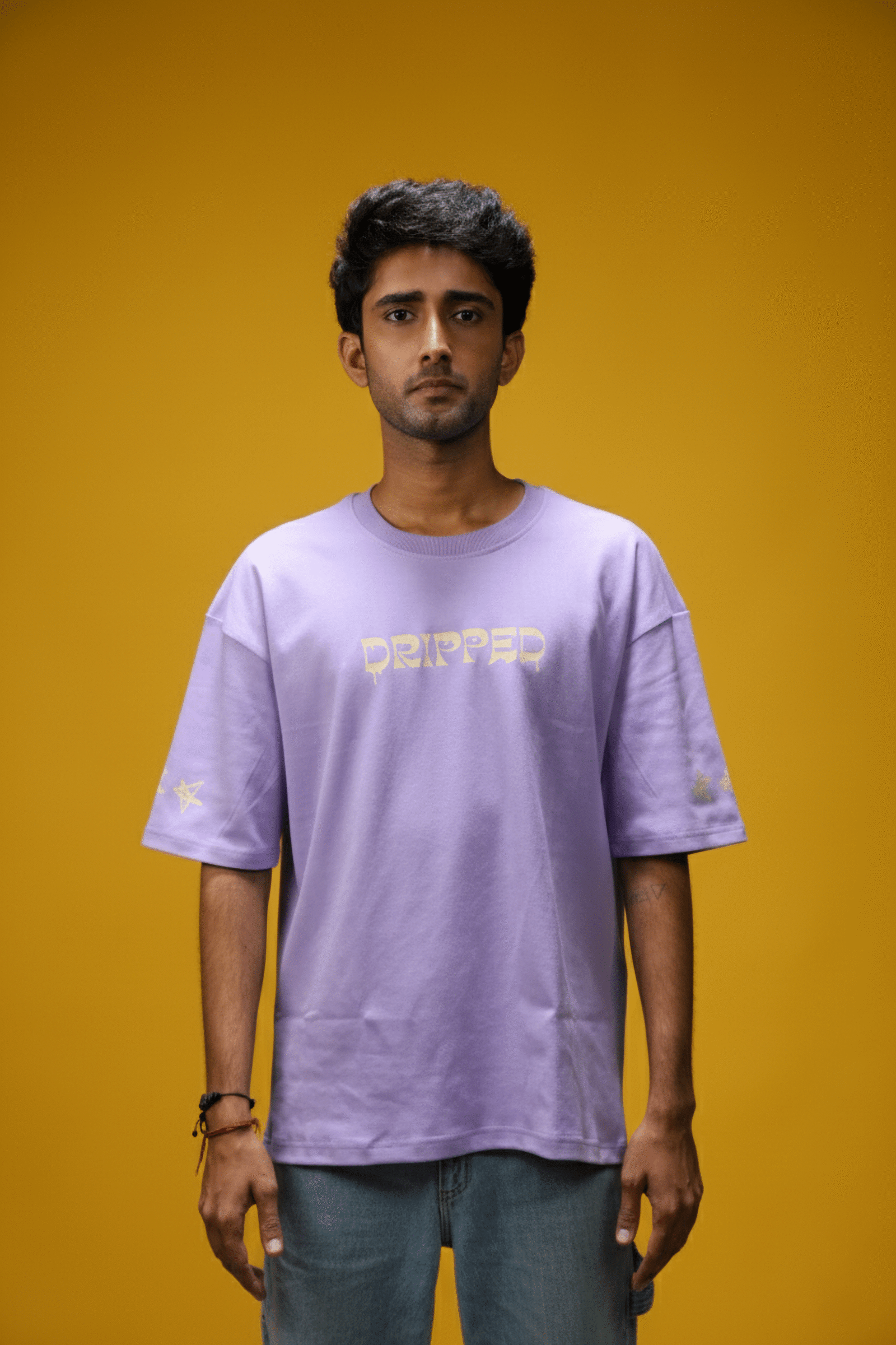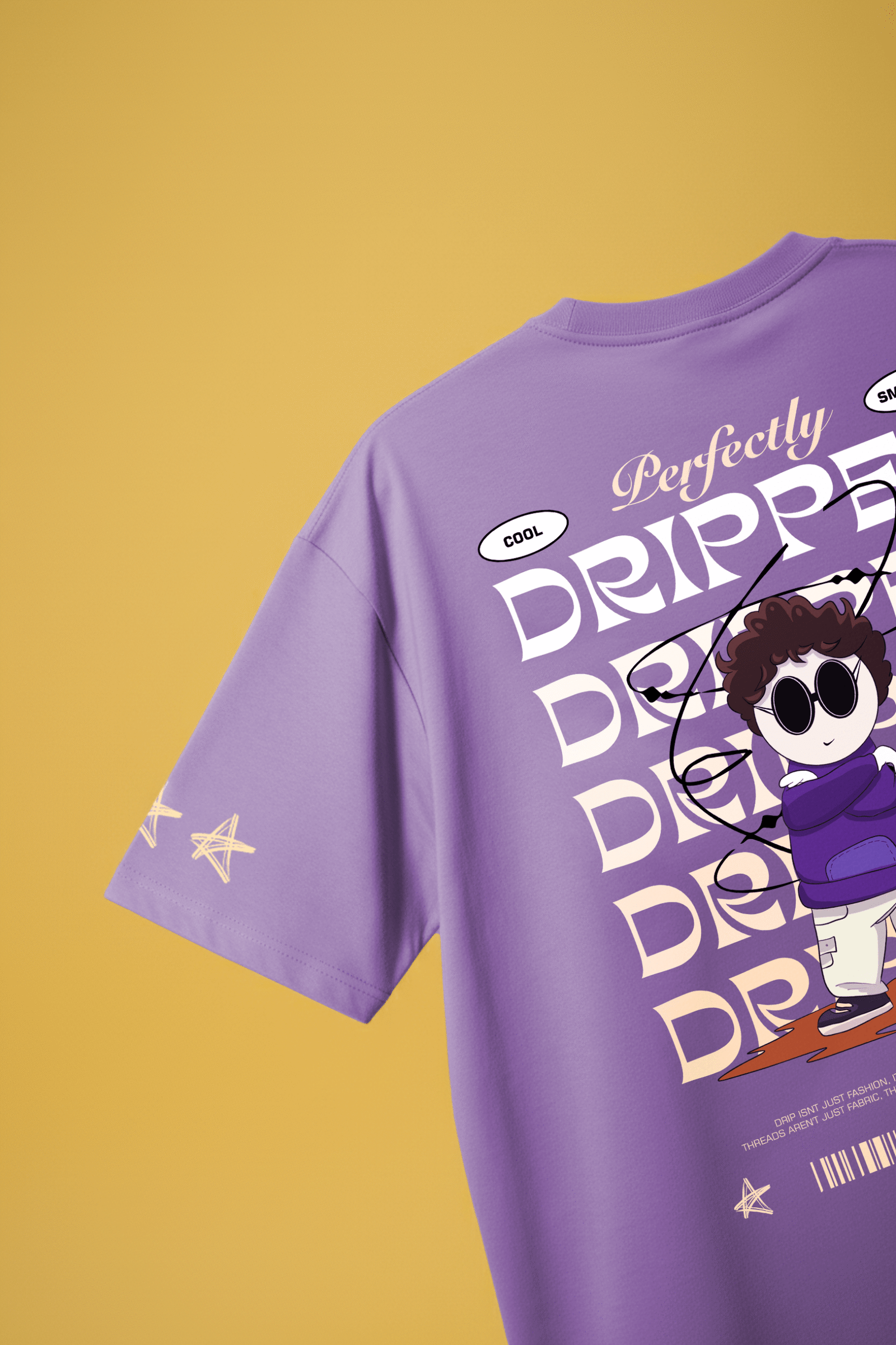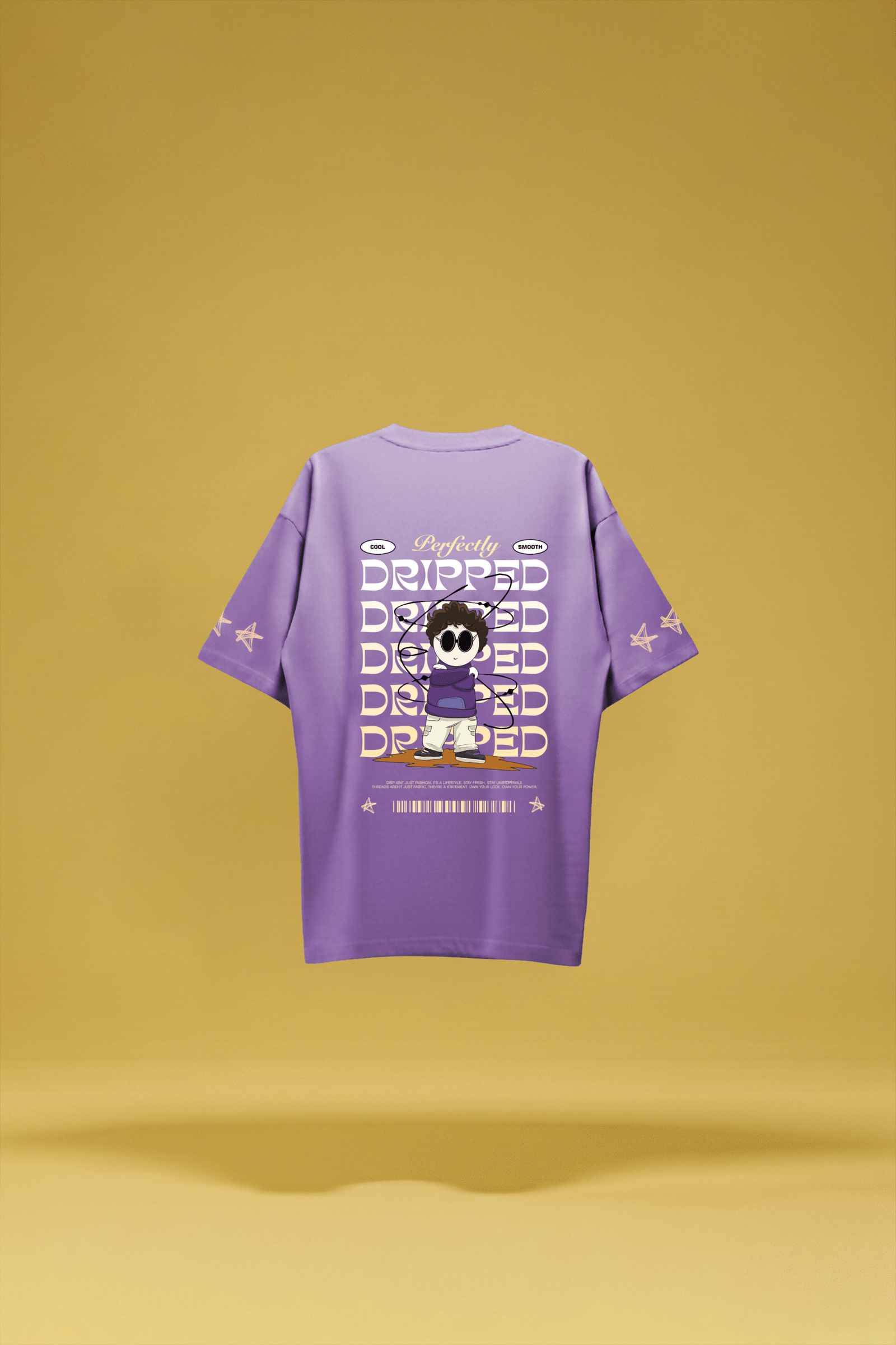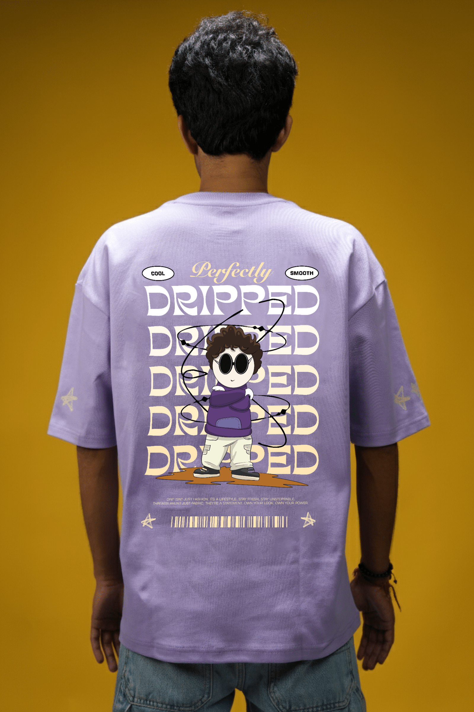This oversized Lunar Lilac tee is built for those who know how to stand out without trying too hard. The front features a bold “DRIPPED” logo in a melting graffiti style, while the back steals the spotlight — a cartoon hero surrounded by cosmic swirls and stacked typography that screams confidence.